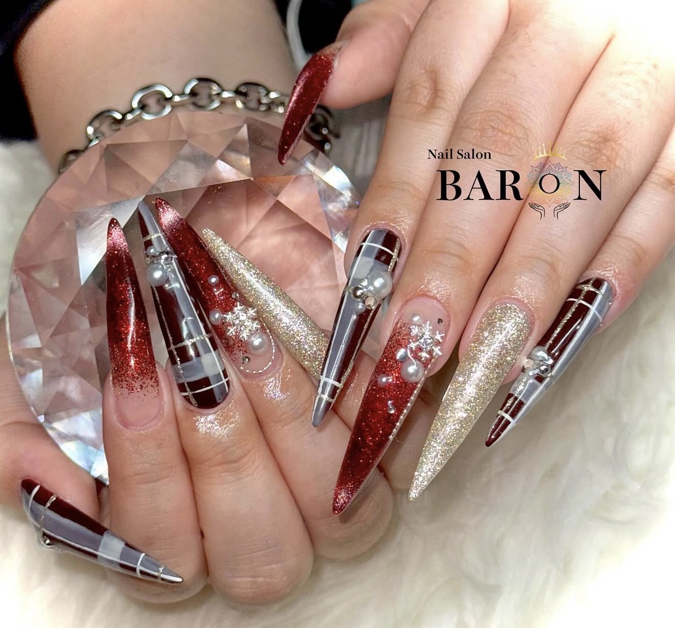 💎 圧倒的存在感!赤×シルバーのスーパーロングスカルプネイル特集 💎 今回ご紹介するのは、一瞬で視線を奪うスーパーロングネイル。 深みのあるレッドグリッターと、上品に輝くシャンパンゴールド、さらにスモーキーブラック&シルバーラインを組み合わせた、まさに「圧倒的存在感」のあるデザインです💅✨ 写真からも伝わるこのインパクト。 ただ長いだけじゃない、フォルム・配色・パーツ配置・バランスのすべてにこだわり抜いた、Nail Salon BARONならではのハイレベルなスカルプネイルです。 📌 [...]