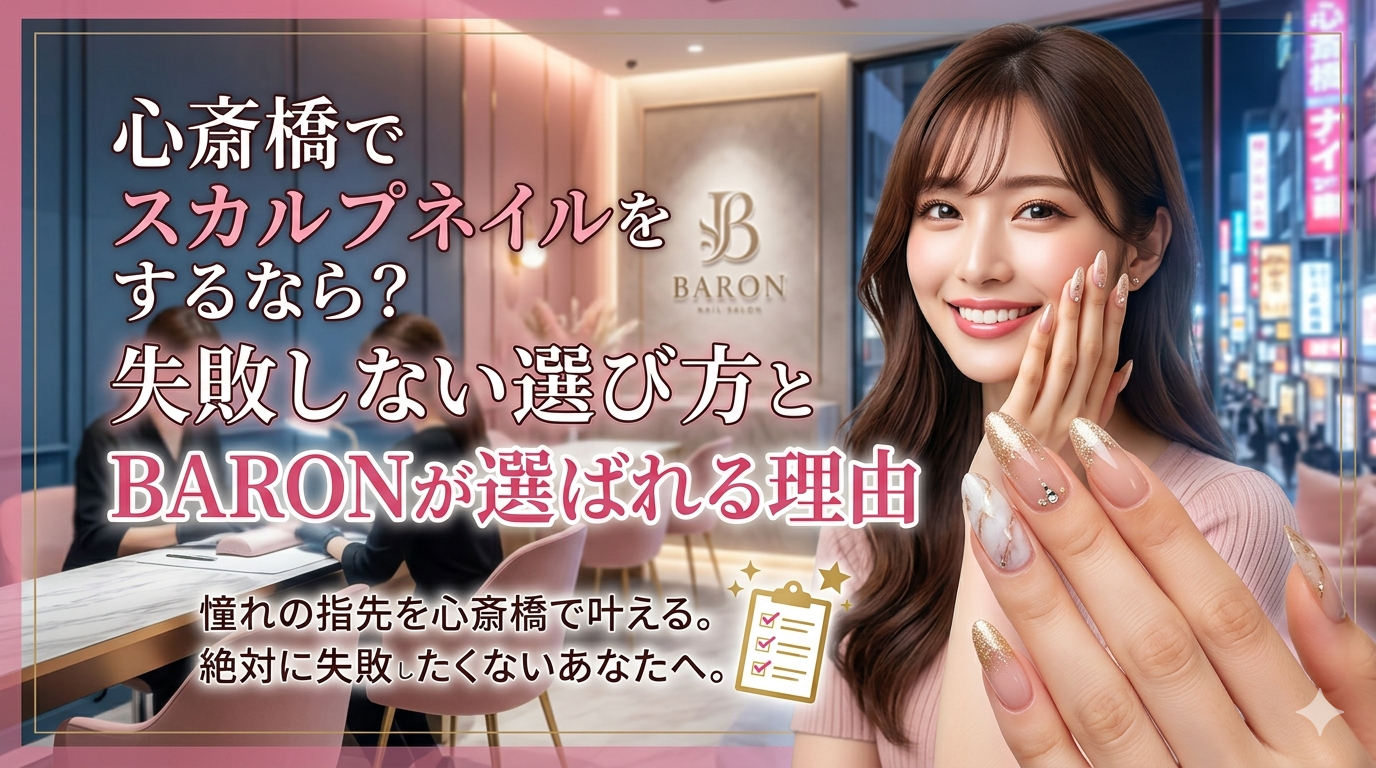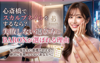 心斎橋でスカルプネイルをするなら?失敗しない選び方とBARONが選ばれる理由 ✅ この記事でわかること: 心斎橋でスカルプネイルのサロン選びに失敗しないための具体的なチェックポイント5つ/スカルプネイルの種類(チップスカルプ・アクリルスカルプ)の違いと選び方/「モチが悪い」「浮く」「仕上がりが思い通りにならない」といった悩みの根本原因と解決策 「心斎橋でスカルプネイルができるサロンを探しているけど、どこに行けばいいかわからない」 「一度スカルプをやって失敗した経験があって、次こそは信頼できる場所に行きたい」 そんなふうに感じている方、多いと思います。 実は、スカルプネイルは施術の難易度がジェルネイルよりも格段に高く、ネイリストの技術力によって仕上がりや持ちが大きく変わるメニューです。「なんとなく良さそう」でサロンを選ぶと、浮き・折れ・左右非対称といったトラブルにつながりやすいのが現実です。 この記事では、スカルプネイルの基礎知識から、心斎橋でサロンを選ぶときに確認すべきポイント、よくある失敗パターンまでを現場目線でまとめました。 最後まで読めば、「どのサロンに行けばいいか」が自分で判断できるようになります。 [...]