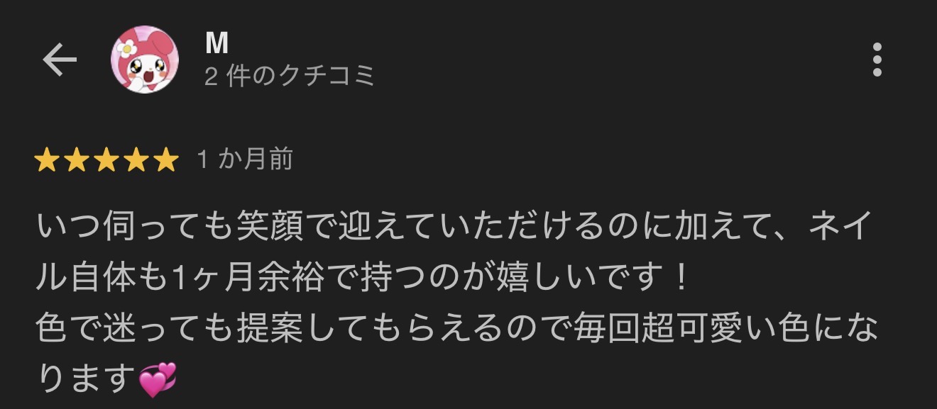 技術力はもちろん、デザインの再現度・持ちの良さ・スピードのバランスが優れており、他サロンから乗り換えるお客様が多数♡