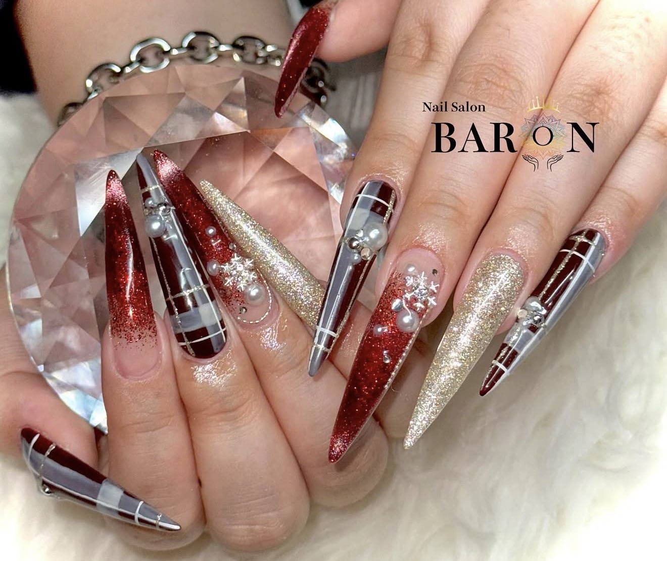 深みのあるボルドーカラーにチェック柄とグリッターを組み合わせた、大人のためのロングネイル。落ち着いた色味の中にもしっかりとした華やかさがあり、上品さとトレンド感を両立しています。イベント・お出かけネイルにも最適で、洗練された指先を演出します💎