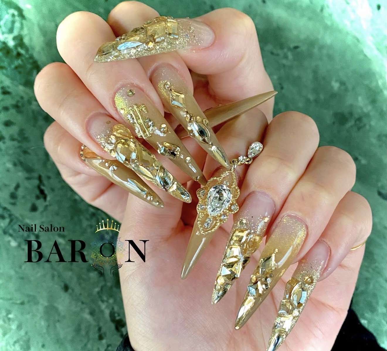 肌なじみの良いゴールドをベースに、贅沢にビジューをあしらったラグジュアリーネイル。指先を動かすたびに輝き、ワンランク上の存在感を演出します。特別な日や主役級ネイルを求める方におすすめ💍 Nail Salon BARONの高級感あふれるデザインです。