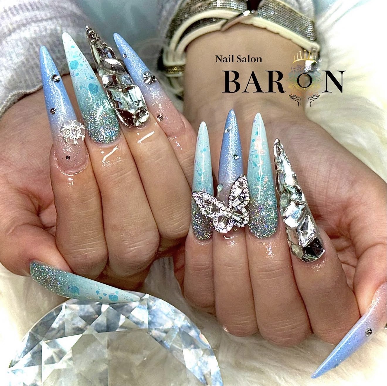 淡いブルーからクリアへと移ろうグラデーションが美しい、透明感あふれるロングネイル。繊細なラメとビジューが光を受けて輝き、清楚さと華やかさを両立✨ 上品だけど映えるネイルを探している方にぴったりで、BARONのデザイン力を感じられる一作です。