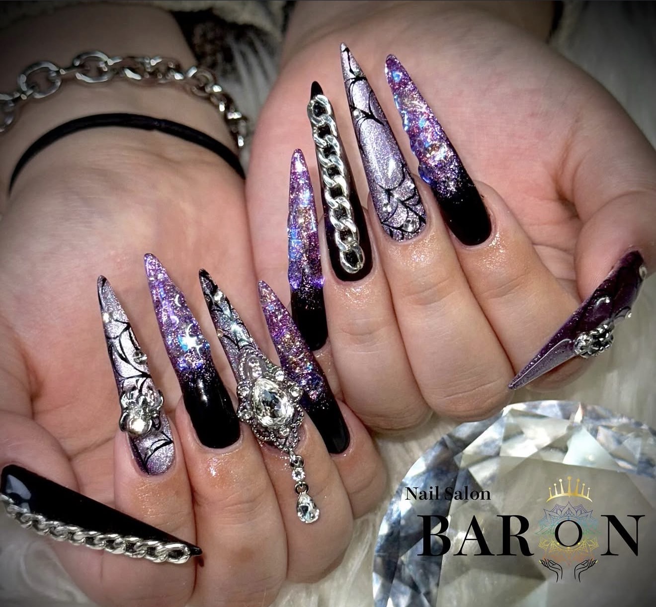 重厚感のあるブラックに、パープルグリッターを重ねたゴシックテイストのスーパーロングネイル。チェーンやビジューを大胆に取り入れ、指先から圧倒的な存在感を放ちます。個性派ネイル・派手ネイル好きな方におすすめで、写真映えも抜群✨ Nail Salon BARONならではの高技術が光るデザインです💅